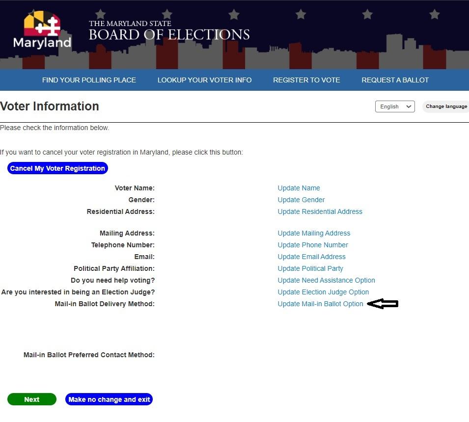 - Once you are on the Voter Information Page, select the “Update Mail-in Ballot Option” option.