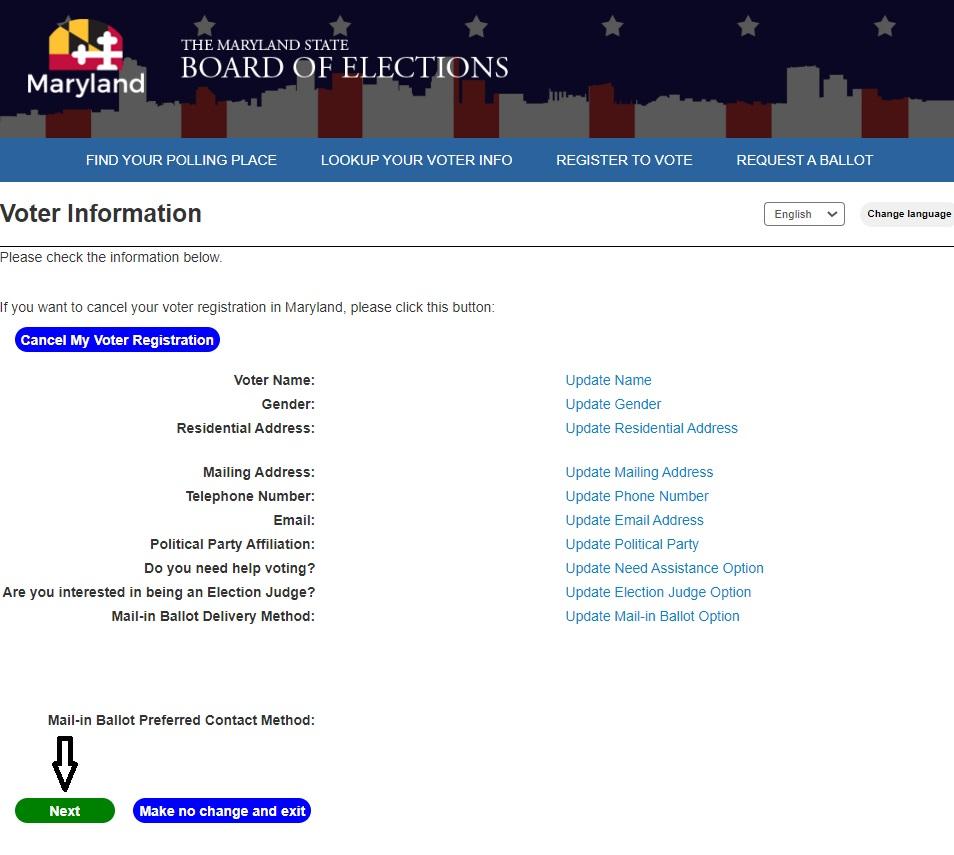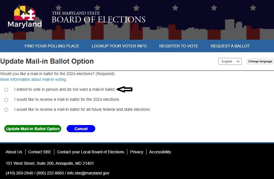 If you have previously requested a mail-in ballot and would like to vote in person, you will need to cancel your mail-in ballot. The easiest way to cancel your mail-in ballot request is online via our Voter Registration Update Page here: Maryland’s Online Voter Registration System (OLUP).
